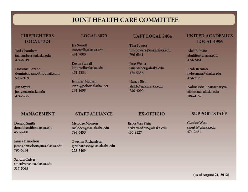The Joint Health Care Committee (JHCC) is a 17-member group comprised of members from four unions. The unions, each with local chapters, include: International Association of Firefighters, the Alaska Higher Education Crafts and Trade Employees, United Academics and the University of Alaska Federation of Teachers. Each union has three voting seats on the committee.