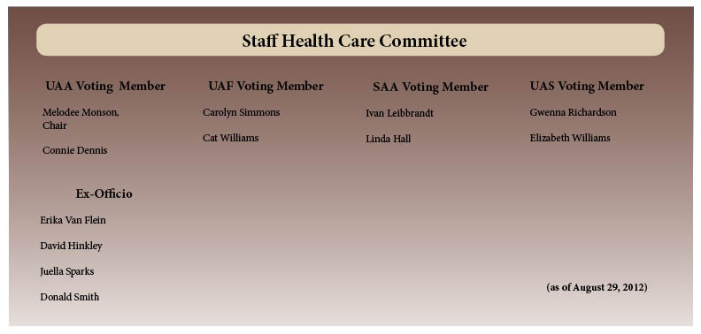 Staff Alliance disperses the information from the JHCC to their governance groups at regularly scheduled meetings. Staff Alliance also relays information to a separate committee, the Staff Health Care Committee, to further inform staff about health plans costs and chances.