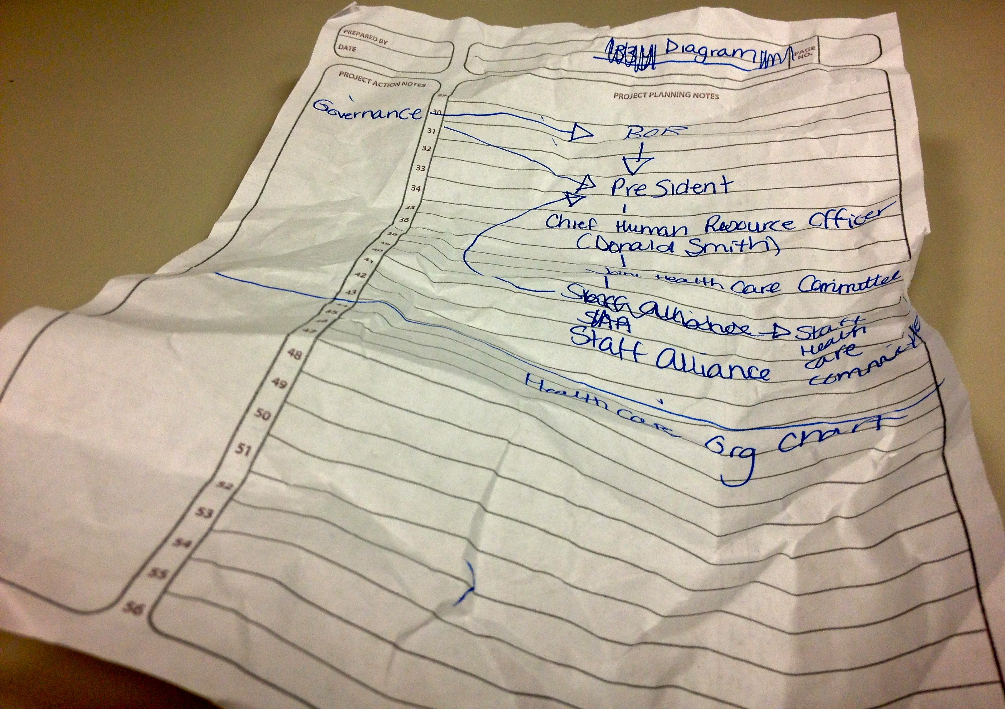The workings in the university system are complicated. At the end of my sixth week of work, I am just now getting a handle on the major players, how they work together and how this all translates to my position. I finally can wrap my head around the health care communication system enough to jot down my thoughts on a crinkled piece of paper (image above). I consider that progress.
