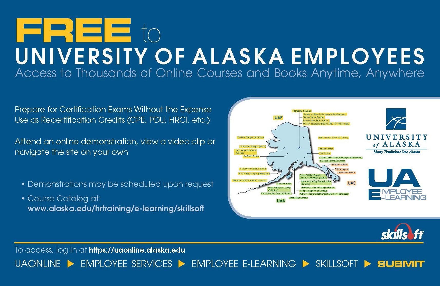 Visit the Training and Development website http://www.alaska.edu/hrtraining/e-learning/skillsoft/ for more information. If you have questions, contact Anne Sakumoto at anne.sakumoto@alaska.edu or (907) 786-1432.