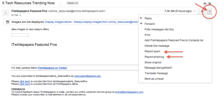 Always err on the side of caution. If you are ever unsure of an inquiry, the best thing to do is NOT click on the link and NOT reply to the email. In Google Apps, you can always report the email as spam or a phishing attempt by clicking on the down arrow and choosing report spam or report phishing. (See image)