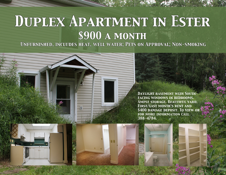 Welcome to the historic community of Ester! This adorable and affordable unit is only 10 minutes from the university. The two-room apartment is $900 a month, includes heat, has a well and features a beautiful kitchen and lots of storage. Click on image to download. Call to view or for more information: 388-4784.