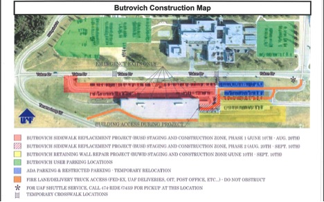Vehicle and pedestrian traffic will be rerouted for the duration of these projects. Vehicular access will be limited to the east entrance. Traffic will circle counterclockwise through a designated driving area. Parking will be limited within the accessible Butrovich parking lot. Additional parking will be available in the lots to the north, adjacent to the Arctic Health Research Building (Lots 9A and 9B). Butrovich occupants are encouraged to park in those lots, as the parking at the Butrovich will be limited and the fire lane will need to stay clear at all times. Emergency vehicles will also be rerouted to the east entrance.