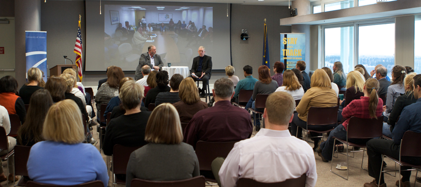 A large turn out of staff in both Anchorage and Fairbanks on Oct. 16 listened as moderator Chief Human Resources Officer Erik Seastedt asked UA President Pat Gamble staff-submitted questions during the sixth bi-annual event.