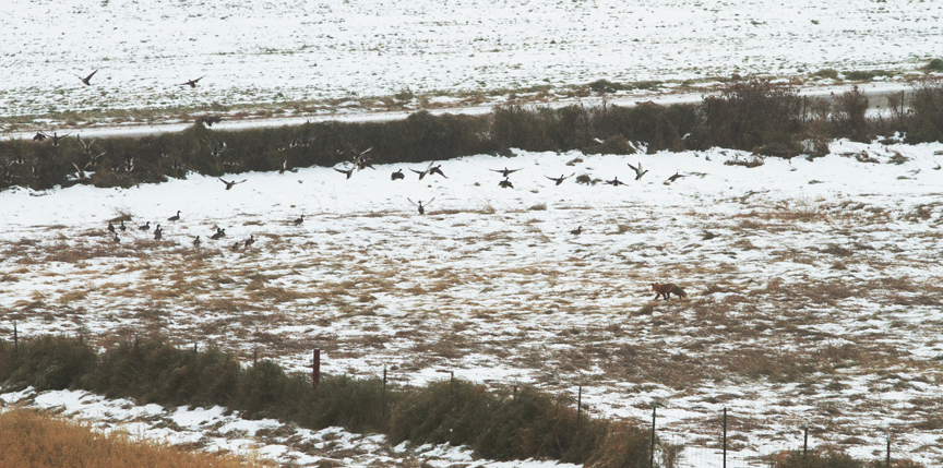 A large group of Mallard ducks stationed on the fields in front of the Butrovich caught the attention of local foxes. Photo by Monique Musick