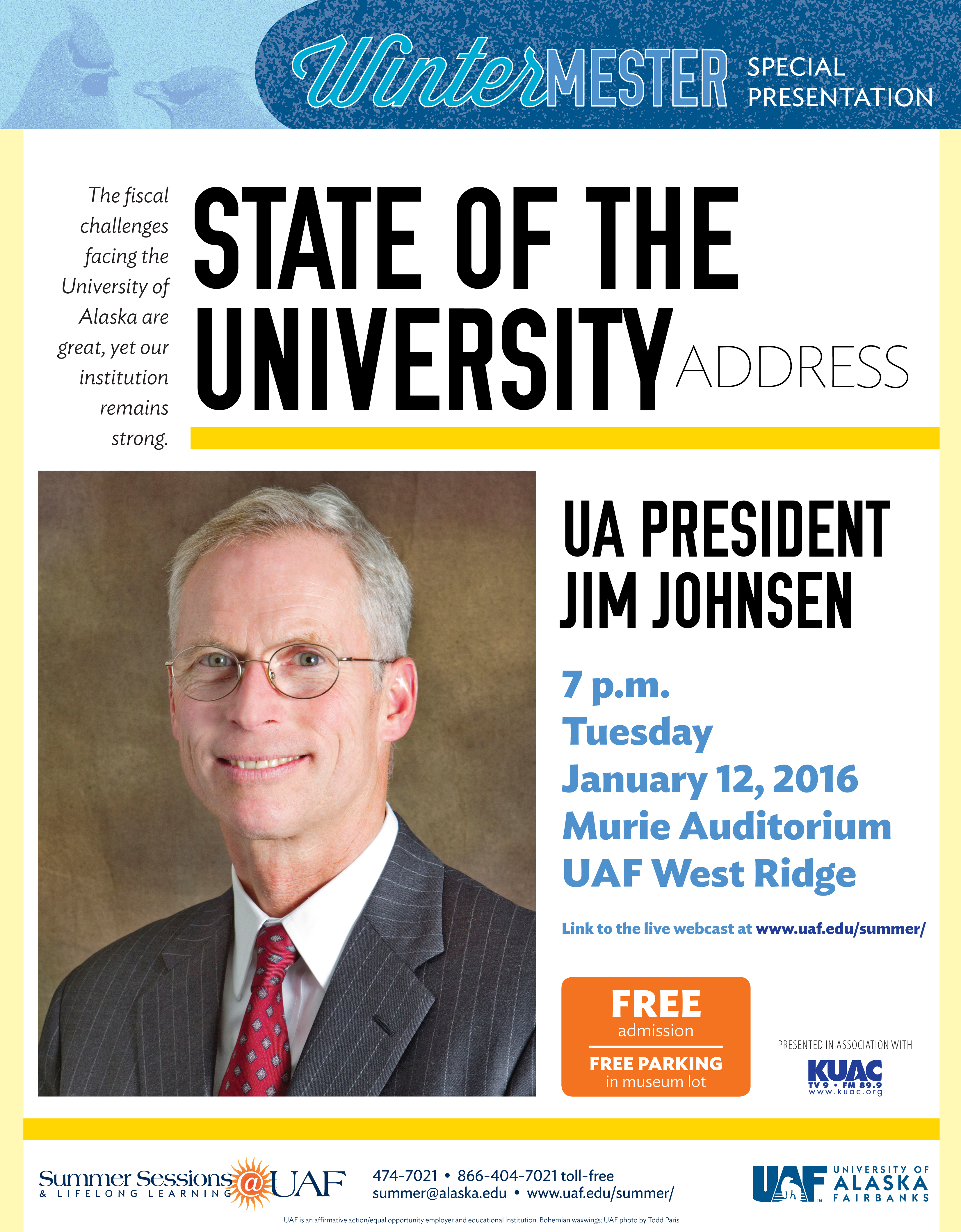 University of Alaska President Jim Johnsen will deliver the State of the University address in the Murie Building auditorium on Tuesday, Jan. 12, at 7 p.m.