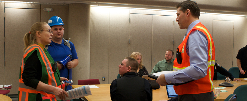 Kate Wattum discusses the Active Shooter Scenario with Emergency Management Director Greg Busch prior to the start of the exercise. Members of the Statewide and UAF Incident Management Team worked together on the training and post-exercise table top scenario. Photo by Monique Musick