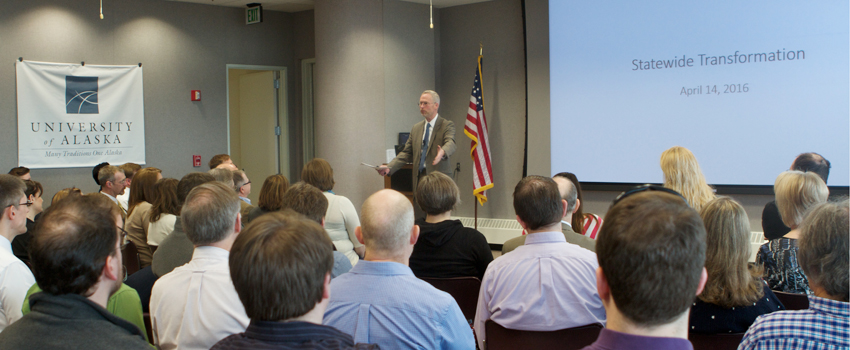 On April 14, President Johnsen met with Statewide (SW) staff in Fairbanks and Anchorage to share decisions regarding Statewide Transformation. The purpose of the transformation process was to articulate SW’s role, and provide broad analysis of structural, cultural, collaborative and management issues that will be important for restructuring the university and creating efficiencies heading into lean budget years. Before announcing the final decisions during the face-to-face meetings, Johnsen considered the recommendations of the SW Transformation Team and subsequent working groups, staff feedback, and discussions with SW leadership and the University of Alaska (UA) Summit Team.